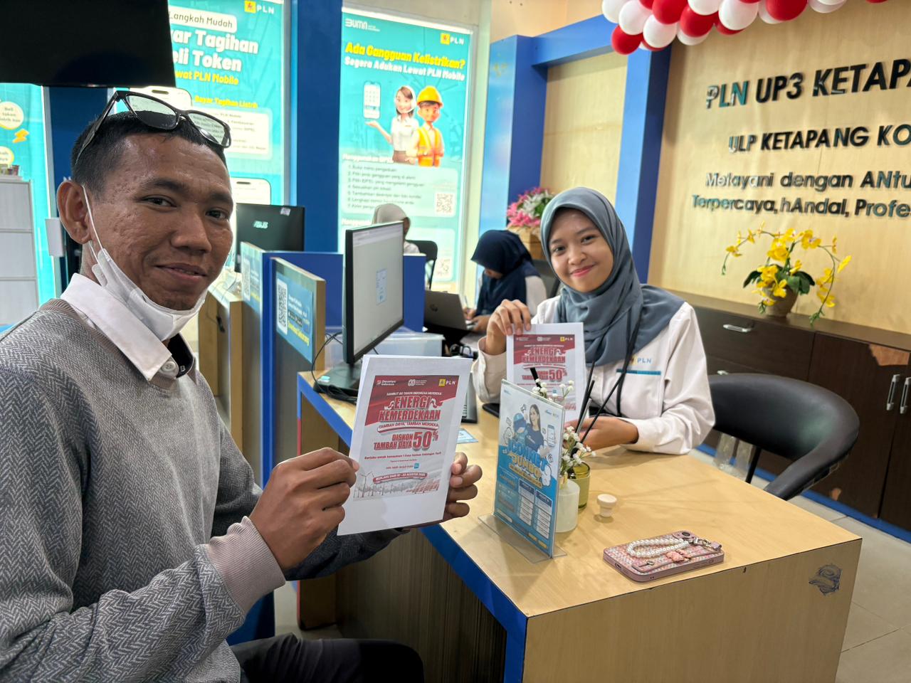 Terlihat senyum pelanggan setelah menerima penjelasan dari petugas PLN  mengenai kemudahan proses promo “Energi Kemerdekaan” yang cukup diakses melalui aplikasi PLN Mobile.(FOTO/DOK/PLN)